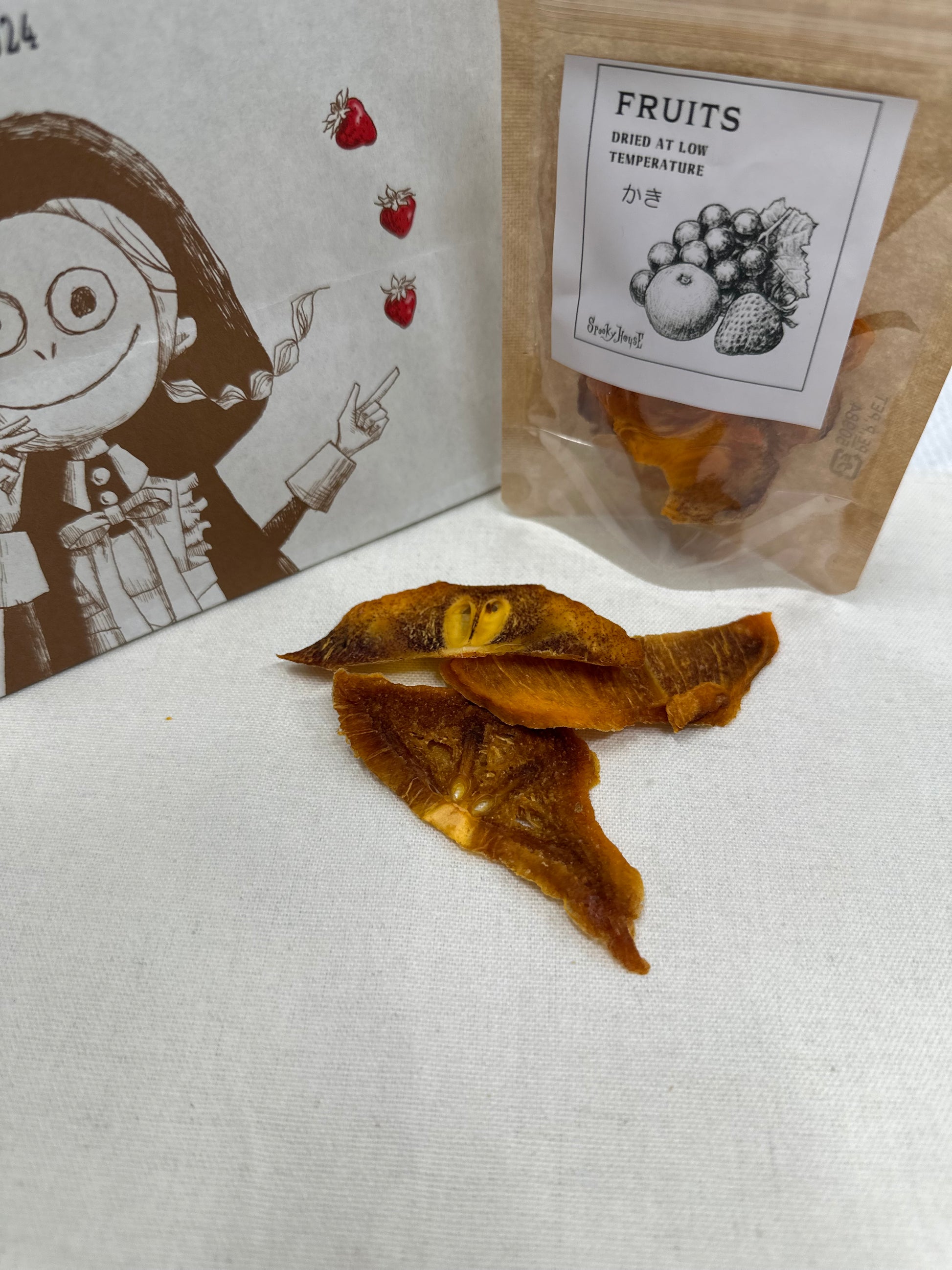 無農薬次郎柿を低温で数日かけて乾燥して詰めています。無添加の為開封後は高温多湿をさけてお早めにお召し上がりください。